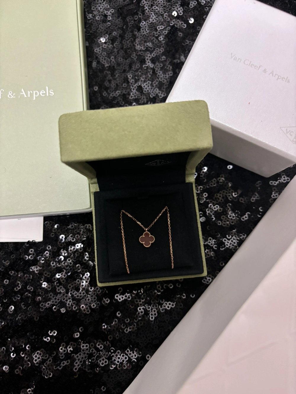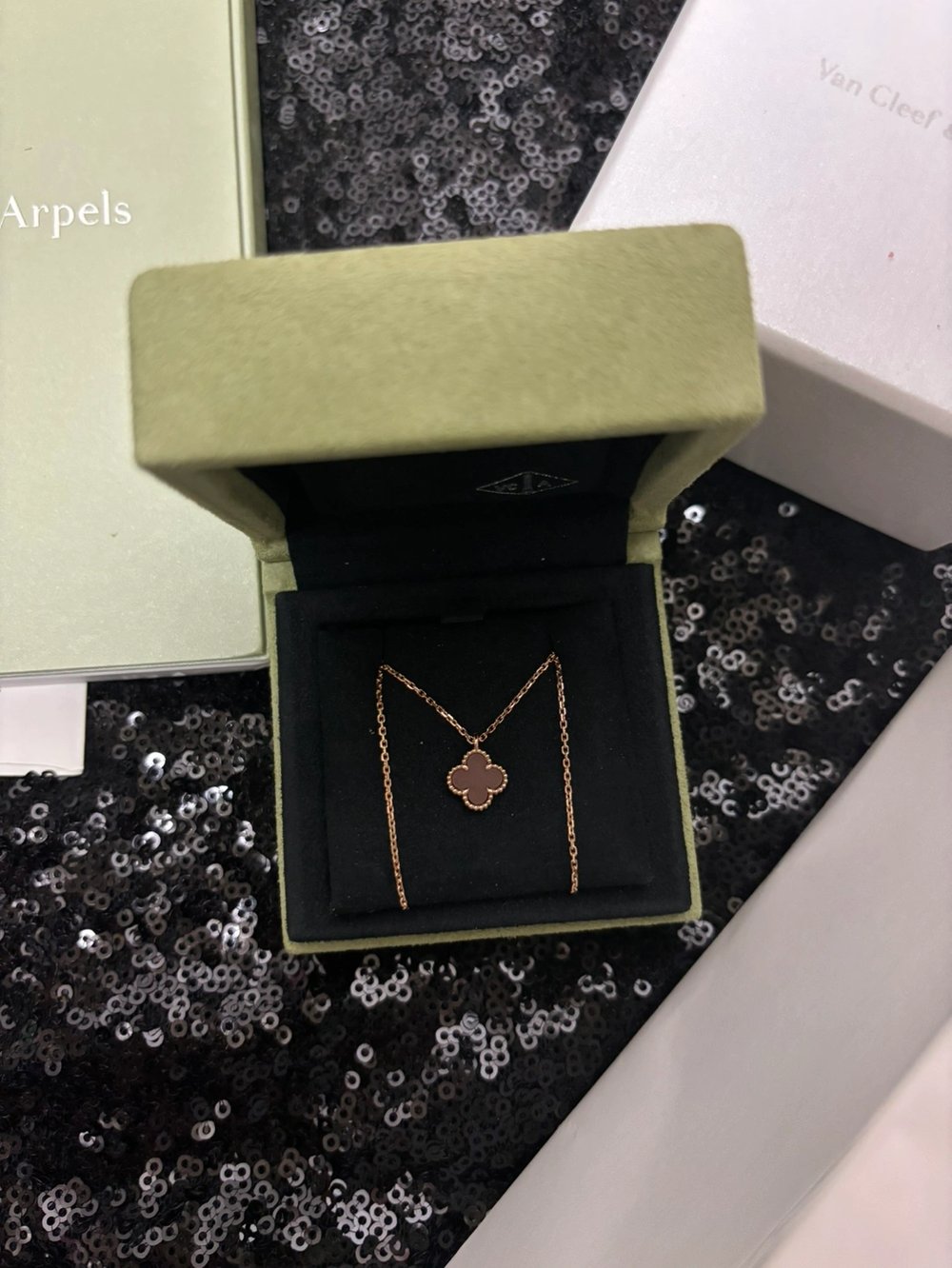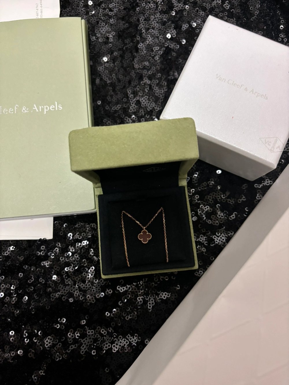 반클리프 아펠 알함브라 2023 홀리데이 네크리스빈티지, 로즈/핑크골드, 세미 파베, 실버 옵시디언
