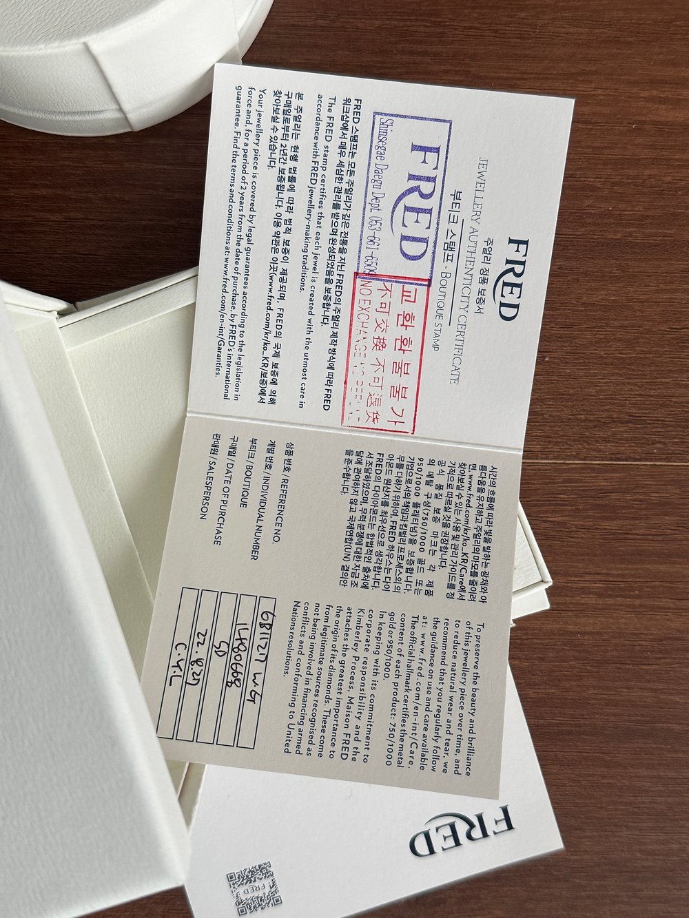 처음으로 중고 주얼리 구매해봤는데 상태도 좋고 마음에 들어용 ! 감정서도 오니 안심도 됩니다. 매장에서 샀던게 아까워지네용 ㅠ 프레드는 처음 사봤는데 너무 마음에 들어용🩷