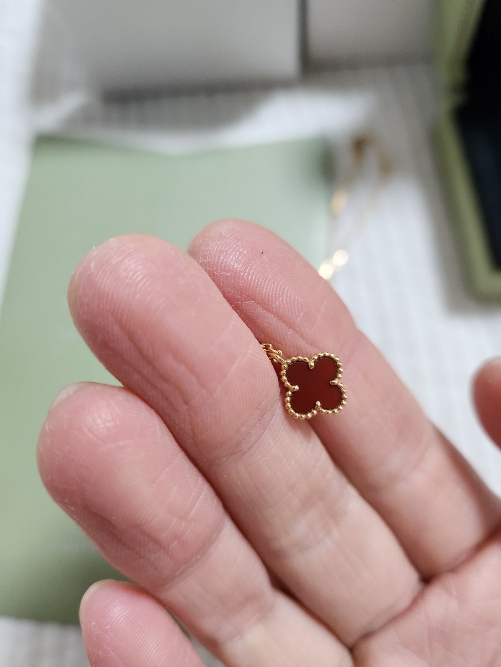 꼼꼼하게 정품 확인하고 배송해줘서 너무 좋았습니다! 스위트라 자개가 작은편이긴 하지만 존재감이 확실합니다:) 조그만한 포인트 목걸이를 좋아하는 편이라 마음에 들어요 합리적인 가격으로 위시템 장착했어요 주얼리는 사랑입니다🫶