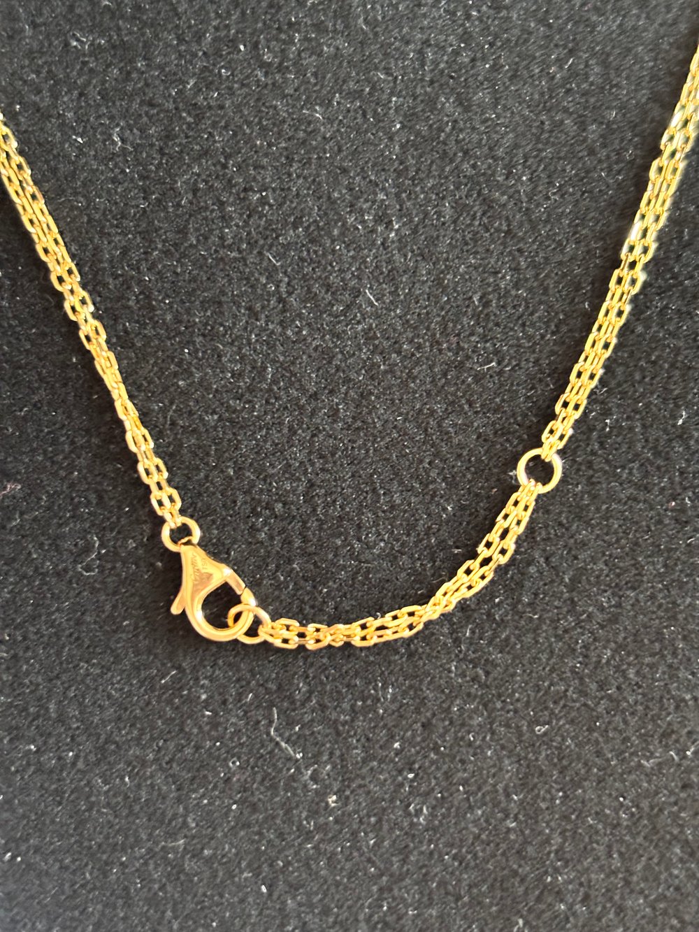 구입 후 6개월 정도 데일리로 착용했어요. 전체적인 상태는 좋습니다만 뚫어지게 보면 팬던트 부분 생활 미세 스크레치 보입니다. 23년 4월 체인 연장 1회했고 이 후에 손이 안가서 쭉 박스에만 있습니다. 옐골이고 총장 45cm 입니다. 두 줄 체인이라 반짝거리고 존재감 있어요.