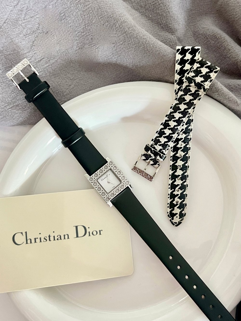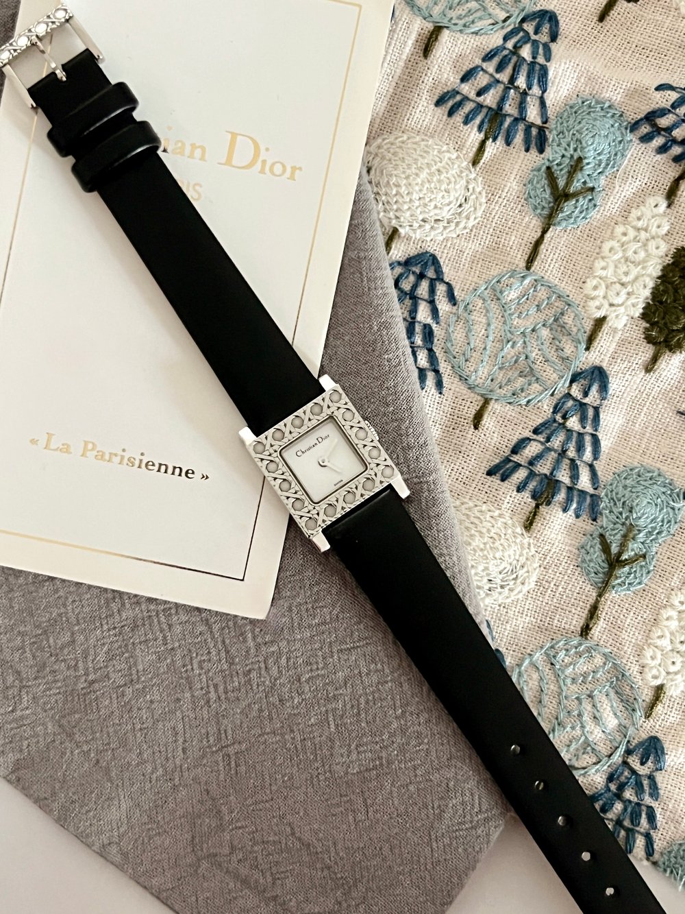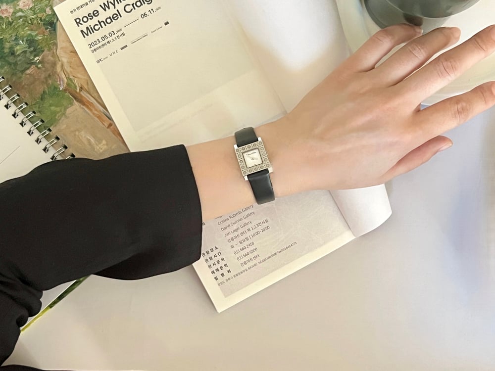 스퀘어 베젤에 시그니처인 까나쥬 패턴이 볼륨감 있게 장식되어 있는 디올만의 감각을 잘 보여주는 시계에요. 논인덱스 다이얼은 블랙 로고와 실버 핸즈만 돋보이도록 미니멀한 디자인이에요. 스트라이프 무늬로 크라운을 커버하는 옆면도 디테일이 눈에 띄어요.