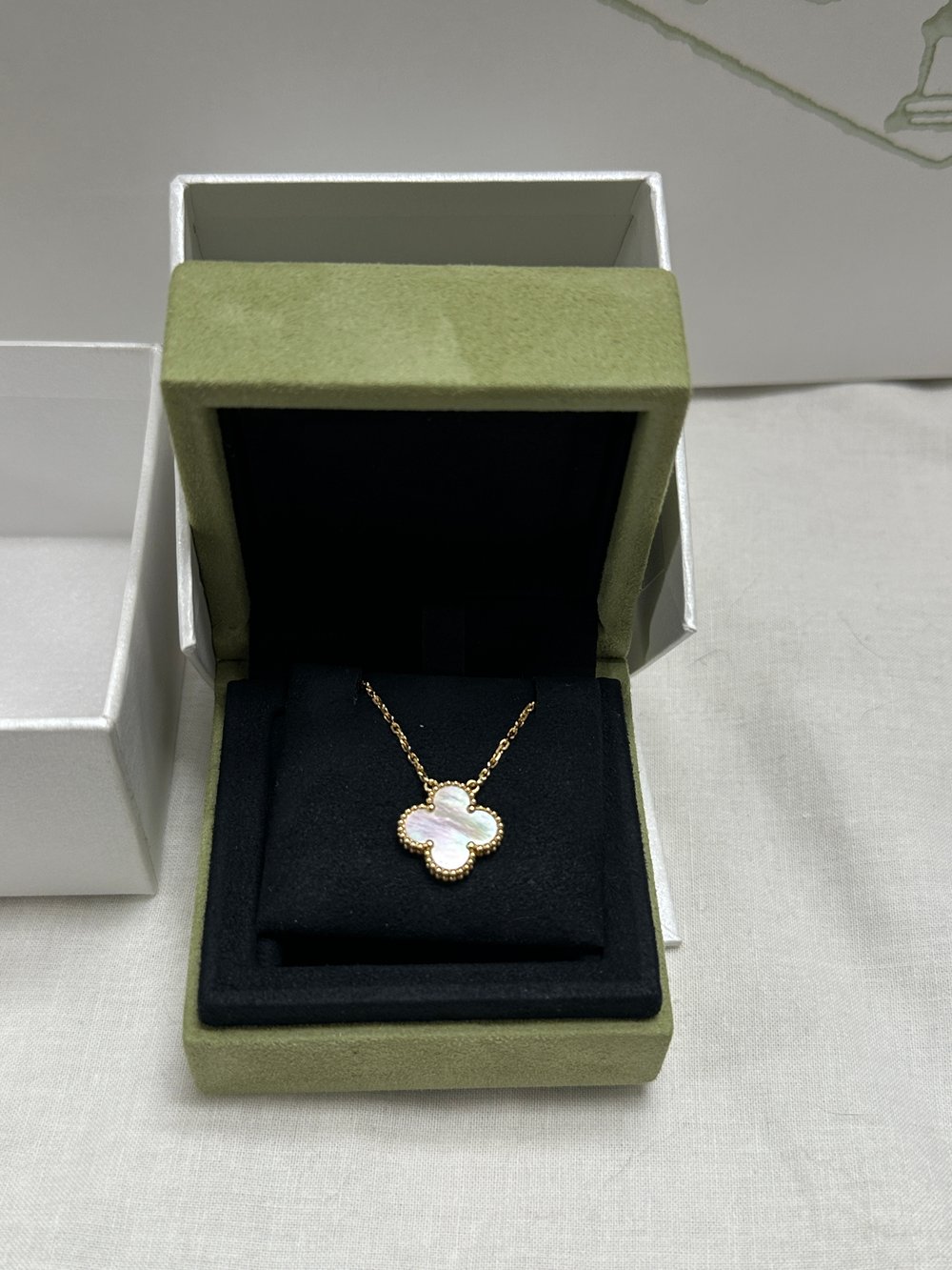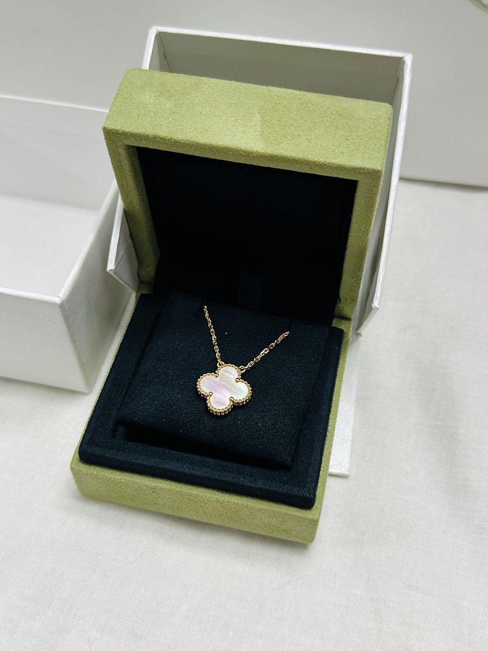 꼼꼼하게 정품 확인하고 배송해줘서 너무 좋았습니다! 스위트라 자개가 작은편이긴 하지만 존재감이 확실합니다:) 조그만한 포인트 목걸이를 좋아하는 편이라 마음에 들어요 합리적인 가격으로 위시템 장착했어요 주얼리는 사랑입니다🫶