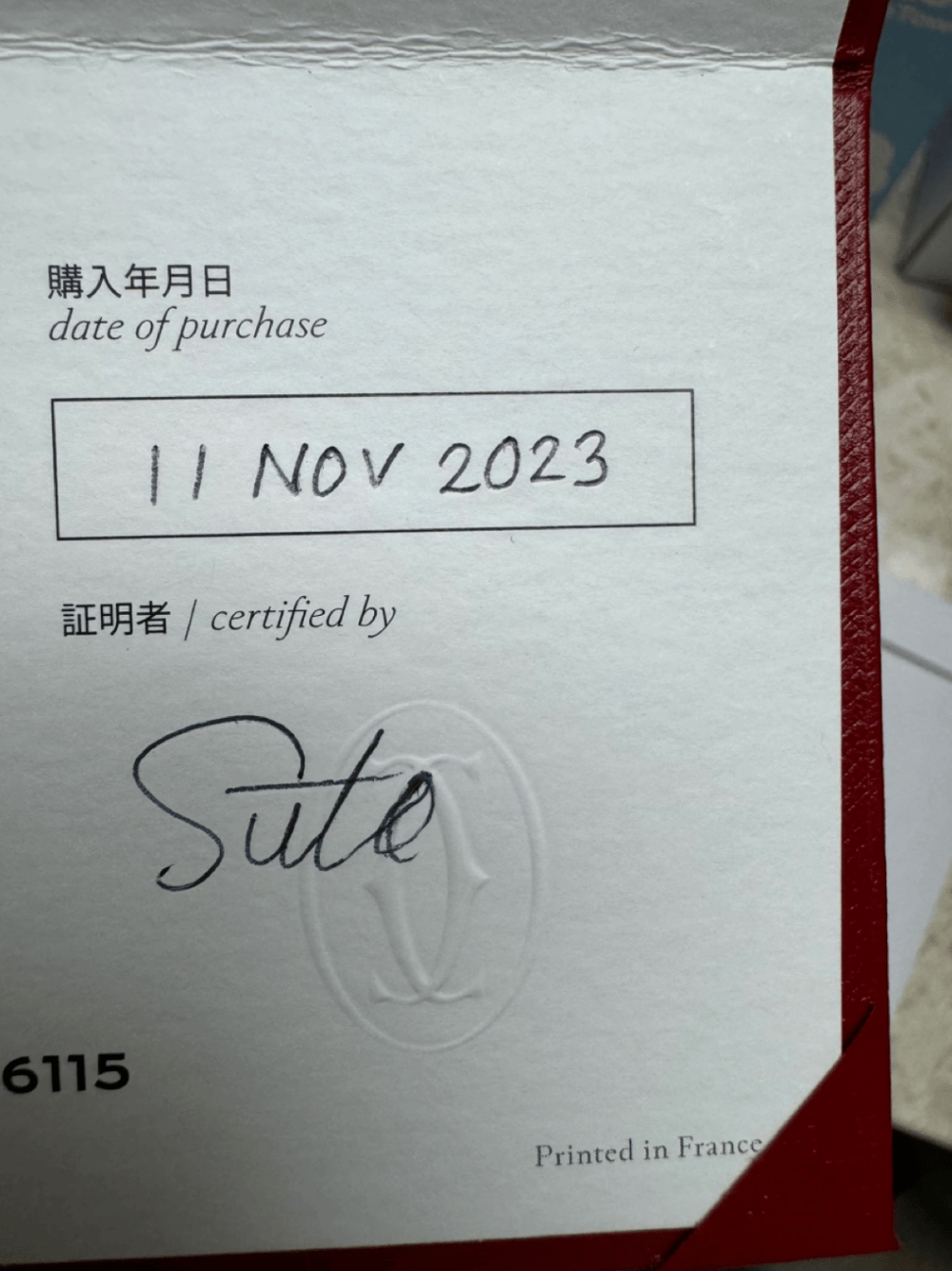 까르띠에 보증서는 카드 형태로 동봉되어 함께 받아보실 수 있어요. 보증서에는 제품 고유의 시리얼 넘버, 구매 날짜, 그리고 구매 매장의 도장까지 모두 표기돼 있어 내 주얼리의 이력을 증명해 주는 공식 문서랍니다. 까르띠에 보증서는 재발급할 수 없으니, 분실에 주의해 주세요. 💍 주얼리 보증서 정보 - 시리얼 넘버: 같은 제품 중에서도 '내 주얼리 한 점'을 구별해주는 고유 번호예요. - 구매일자: 보증 기간의 기준이 되는 날짜로, [년. 월. 일] 형태로 표기돼요. (예: 2025. 09. 24) - 착용 사이즈: 반지나 팔찌 등 착용 사이즈 정보도 함께 확인할 수 있어요. (예: #52) * 보증서에 적힌 시리얼 넘버와 사이즈는 제품 안쪽 각인과 동일하답니다. ⌚ 워치 보증서 정보 (워런티 카드) 까르띠에 워치는 종이 보증서 대신 '워런티 카드(Warranty Card)' 형태로 발급돼요. 카드에는 다음과 같은 정보가 담겨 있답니다. - 시리얼 넘버 - 제품 번호 - 제품 컬렉션 & 소재 - 구매일자: 주얼리와 동일하게 년. 월. 일 형식으로 표기됩니다. (예: 2024. 01. 11) 🧾 그리고 많은 분이 헷갈리는 부분이 '인보이스와의 날짜 표기' 차이인데요. 구매 시 함께 제공되는 '인보이스(Invoice)'의 날짜 표기 방식은 보증서와 달라요. 예를 들어 2024년 1월 11일에 구매한 제품이라면, 1️⃣ 보증서 → 2024. 01. 11 (년 → 월 → 일) 2️⃣ 인보이스 → 11. 01. 2024 (일 → 월 → 년) 즉, 인보이스는 보증서와 반대로 표기된다는 점 기억해 두시면 좋아요😉 💡 페이브릴 Tip. 까르띠에 보증서가 정품 여부를 100% 보장하는 건 아니에요. 공식 매장에서도 보증서 없이 A/S를 받을 수 있답니다. 다만, 보증서는 내 주얼리에 대한 정보를 담고 있는 유일한 공식 문서예요. 추후 재판매나 감정 시, 제품의 가치를 높여주는 중요한 증빙 자료로 활용될 수 있어요.