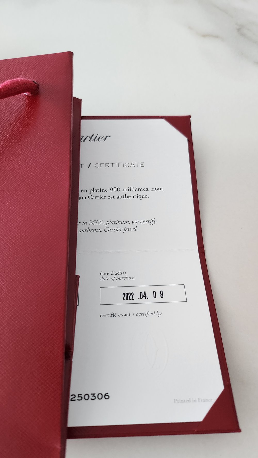 까르띠에 보증서는 카드 형태로 동봉되어 함께 받아보실 수 있어요. 보증서에는 제품 고유의 시리얼 넘버, 구매 날짜, 그리고 구매 매장의 도장까지 모두 표기돼 있어 내 주얼리의 이력을 증명해 주는 공식 문서랍니다. 까르띠에 보증서는 재발급할 수 없으니, 분실에 주의해 주세요. 💍 주얼리 보증서 정보 - 시리얼 넘버: 같은 제품 중에서도 '내 주얼리 한 점'을 구별해주는 고유 번호예요. - 구매일자: 보증 기간의 기준이 되는 날짜로, [년. 월. 일] 형태로 표기돼요. (예: 2025. 09. 24) - 착용 사이즈: 반지나 팔찌 등 착용 사이즈 정보도 함께 확인할 수 있어요. (예: #52) * 보증서에 적힌 시리얼 넘버와 사이즈는 제품 안쪽 각인과 동일하답니다. ⌚ 워치 보증서 정보 (워런티 카드) 까르띠에 워치는 종이 보증서 대신 '워런티 카드(Warranty Card)' 형태로 발급돼요. 카드에는 다음과 같은 정보가 담겨 있답니다. - 시리얼 넘버 - 제품 번호 - 제품 컬렉션 & 소재 - 구매일자: 주얼리와 동일하게 년. 월. 일 형식으로 표기됩니다. (예: 2024. 01. 11) 🧾 그리고 많은 분이 헷갈리는 부분이 '인보이스와의 날짜 표기' 차이인데요. 구매 시 함께 제공되는 '인보이스(Invoice)'의 날짜 표기 방식은 보증서와 달라요. 예를 들어 2024년 1월 11일에 구매한 제품이라면, 1️⃣ 보증서 → 2024. 01. 11 (년 → 월 → 일) 2️⃣ 인보이스 → 11. 01. 2024 (일 → 월 → 년) 즉, 인보이스는 보증서와 반대로 표기된다는 점 기억해 두시면 좋아요😉 💡 페이브릴 Tip. 까르띠에 보증서가 정품 여부를 100% 보장하는 건 아니에요. 공식 매장에서도 보증서 없이 A/S를 받을 수 있답니다. 다만, 보증서는 내 주얼리에 대한 정보를 담고 있는 유일한 공식 문서예요. 추후 재판매나 감정 시, 제품의 가치를 높여주는 중요한 증빙 자료로 활용될 수 있어요.