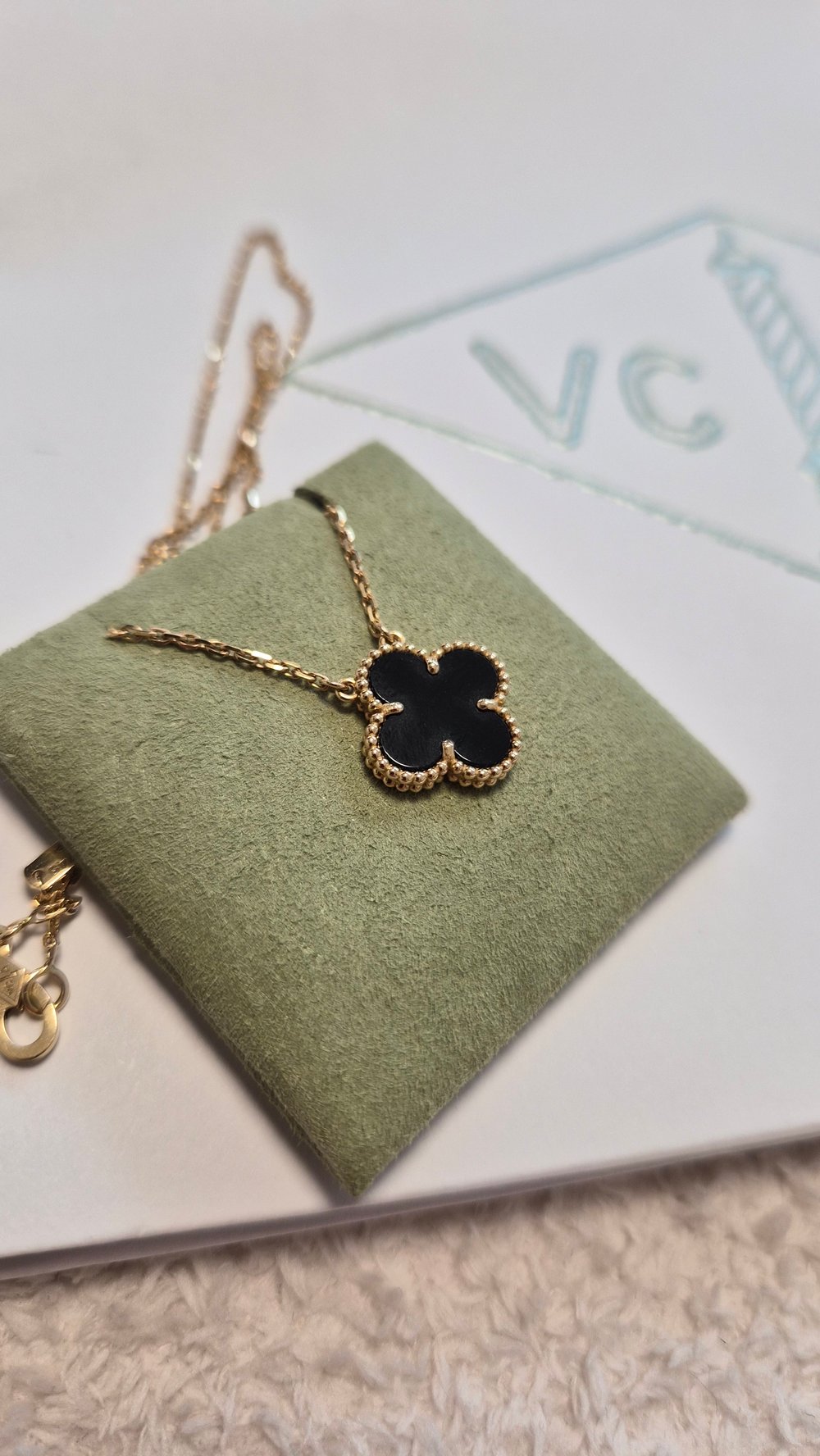 스위트 16모티브, 빈티지 20모티브가 있는 반클리프 알함브라 해머드는 가장 관리하기 편하다는 장점과 기요세만큼 과하게 빛나지 않고 은은하게 빛나서 데일리로 고급스럽게 착용하기 좋은데요. 자개와 레이어링에도 좋고, 롱 네크리스는 피쉬고리를 어느 위치에 거느냐에 따라 스타일이 달라져요. ✔︎ 빈티지 20모티브와 스위트 16모티브와 같이 롱 네크리스는 길게 늘어뜨려서 착용뿐만 아니라 - 한 번 감아서 착용해도 좋고, - 피쉬고리를 모티브들 사이에 걸어서 착용해도 좋아요. Y자 모양으로 떨어져 색다른 느낌을 줄 수 있어요. ✔︎ 다른 모티브 네크리스나 브레이슬릿을 연결도 가능해요. 스위트 16모티브 네크리스에 + 빈티지 다이아 5모티브 브레이슬릿 / 말라카이트 10모티브 네크리스를 연결하면 모티브 크기와 간격이 달라서 다른 느낌을 주고 더 우아하고 풍성한 느낌을 줘요. 물론 두 번 감을 수도 있어요.