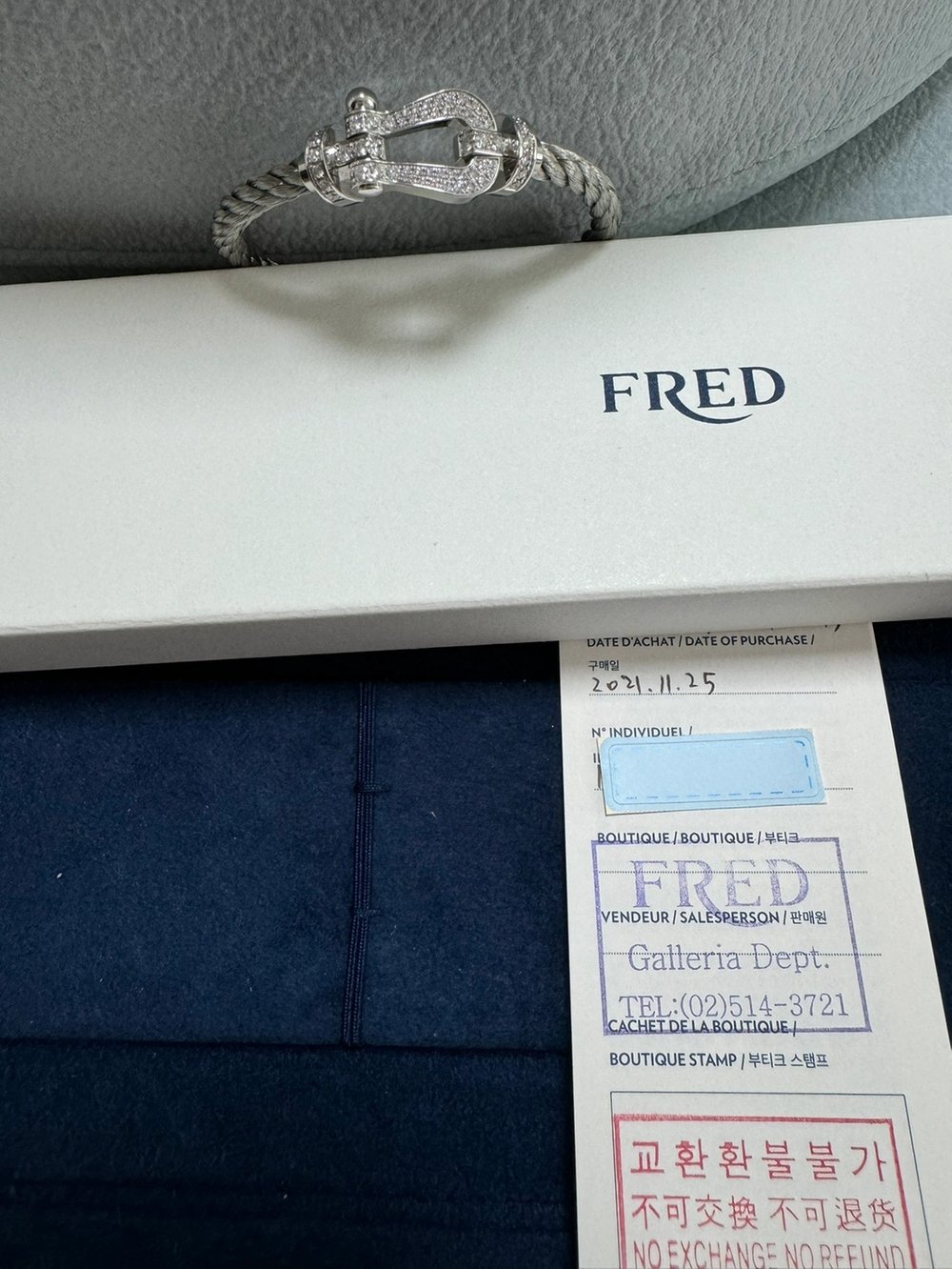 프레드 보증서는 제품 카테고리(팔찌, 목걸이, 귀걸이)에 따라 보관 위치와 형태가 조금씩 달라요. 처음 케이스를 열었을 때 “어? 보증서가 없는데?” 싶으셨다면, 아마도 제품마다 다른 구성 때문일지도 몰라요 😊 ⚓ 팔찌 (미디엄·라지 모델) 미디엄 사이즈 이상 모델부터 긴 종이 형태로 들어 있어요. 표지에는 ‘착용법’ 이라고 적혀 있어서 처음엔 사용설명서로 착각하기 쉽지만, 펼쳐보면 안쪽에 보증서 정보가 함께 기재돼 있답니다. [보증서에서 확인할 수 있는 정보] - 제품 번호: 버클과 케이블 각각의 제품 번호가 적혀 있어요. 케이블 제품 번호 뒤에는 #12처럼 착용 사이즈가 함께 표시돼요. (예: 1B1234, 2B1234 #12) - 구매 일자 : 보증 기간의 기준이 되는 날짜로, [년. 월. 일] 형태로 표기돼요. (예: 2025. 09. 24) - 시리얼 넘버 : 같은 모델 중에서도 ‘내 주얼리 한 점’을 구별해주는 고유 번호예요. - 매장 이름 : 구매하신 공식 매장의 이름이 기재돼요. *현재는 긴 종이 형태가 일반적이지만, 예전 구매 제품은 '정사각형' 형태로 작은 파우치 안에 들어 있기도 해요. 💎 목걸이 · 귀걸이 · 팔찌(스몰 모델) 이 제품들은 박스 구조가 조금 달라요. 보증서는 제품이 담긴 박스 맨 아래쪽, 서랍형 공간에 보관되어 있답니다. 작은 끈을 살짝 당기면, 안쪽에 정사각형 모양의 보증서를 확인하실 수 있어요. 💡페이브릴 Tip. 프레드 보증서는 케이스 안에 함께 보관되는 형태라 분실 우려가 적은 편이에요. 내 주얼리에 대한 정보를 담고 있는 유일한 공식 문서로, 추후 재판매나 감정 시 제품의 가치를 높여주는 중요한 증빙 자료로 활용될 수 있어요.