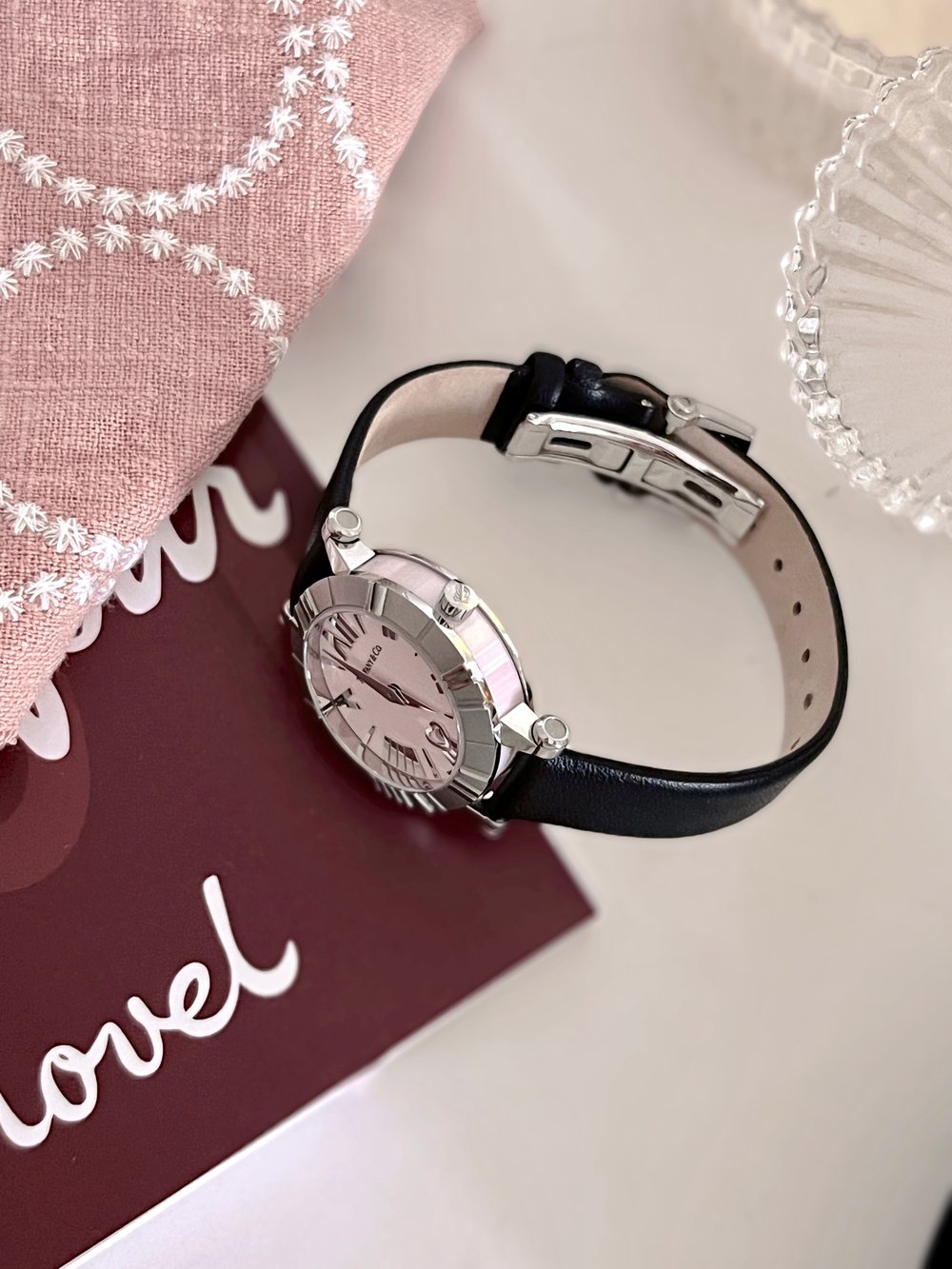 화사한 라이트 핑크 다이얼과 양각된 실버 로만 인덱스와 6시 방향 하트모양의 데이트창이 사랑스러움 그 자체에요.