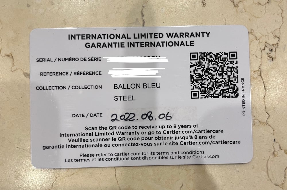 까르띠에 보증서는 카드 형태로 동봉되어 함께 받아보실 수 있어요. 보증서에는 제품 고유의 시리얼 넘버, 구매 날짜, 그리고 구매 매장의 도장까지 모두 표기돼 있어 내 주얼리의 이력을 증명해 주는 공식 문서랍니다. 까르띠에 보증서는 재발급할 수 없으니, 분실에 주의해 주세요. 💍 주얼리 보증서 정보 - 시리얼 넘버: 같은 제품 중에서도 '내 주얼리 한 점'을 구별해주는 고유 번호예요. - 구매일자: 보증 기간의 기준이 되는 날짜로, [년. 월. 일] 형태로 표기돼요. (예: 2025. 09. 24) - 착용 사이즈: 반지나 팔찌 등 착용 사이즈 정보도 함께 확인할 수 있어요. (예: #52) * 보증서에 적힌 시리얼 넘버와 사이즈는 제품 안쪽 각인과 동일하답니다. ⌚ 워치 보증서 정보 (워런티 카드) 까르띠에 워치는 종이 보증서 대신 '워런티 카드(Warranty Card)' 형태로 발급돼요. 카드에는 다음과 같은 정보가 담겨 있답니다. - 시리얼 넘버 - 제품 번호 - 제품 컬렉션 & 소재 - 구매일자: 주얼리와 동일하게 년. 월. 일 형식으로 표기됩니다. (예: 2024. 01. 11) 🧾 그리고 많은 분이 헷갈리는 부분이 '인보이스와의 날짜 표기' 차이인데요. 구매 시 함께 제공되는 '인보이스(Invoice)'의 날짜 표기 방식은 보증서와 달라요. 예를 들어 2024년 1월 11일에 구매한 제품이라면, 1️⃣ 보증서 → 2024. 01. 11 (년 → 월 → 일) 2️⃣ 인보이스 → 11. 01. 2024 (일 → 월 → 년) 즉, 인보이스는 보증서와 반대로 표기된다는 점 기억해 두시면 좋아요😉 💡 페이브릴 Tip. 까르띠에 보증서가 정품 여부를 100% 보장하는 건 아니에요. 공식 매장에서도 보증서 없이 A/S를 받을 수 있답니다. 다만, 보증서는 내 주얼리에 대한 정보를 담고 있는 유일한 공식 문서예요. 추후 재판매나 감정 시, 제품의 가치를 높여주는 중요한 증빙 자료로 활용될 수 있어요.